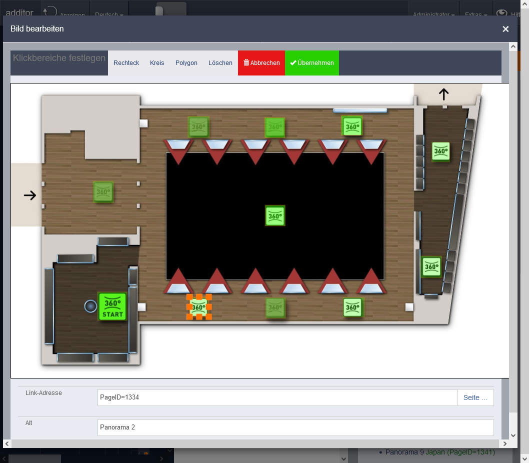 Die Karte wird mit einem Bildeintrag in das Seitenlayout eingefügt und ist dort der einzig benötigte Eintrag. Die einzelnen weiterführenden Elemente können über die Funktion "Klickbereiche" in das Bild eingepflegt werden. Diese Funktion ist unter "Bild bearbeiten" zu finden (siehe additor: Bild bearbeiten).