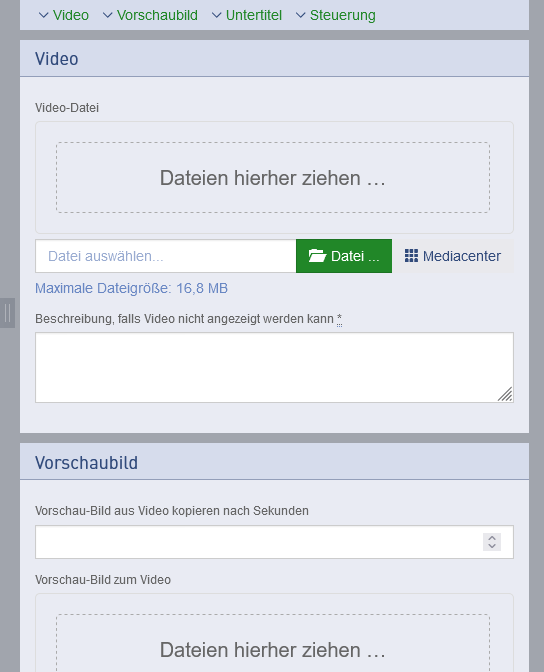 Um den Anforderungen der Barrierefreiheit zu genügen (WCAG 2.1 - Kriterium 1.2.2) können Sie eine VTT-Datei hochladen. Damit können im Video Untertitel angezeigt werden, die insbesondere Menschen die nicht oder schlecht hören können, zu Gute kommen.